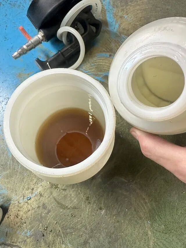 ブレーキオイルの交換の様子と、抜いた古いブレーキオイルと新しいオイルです。